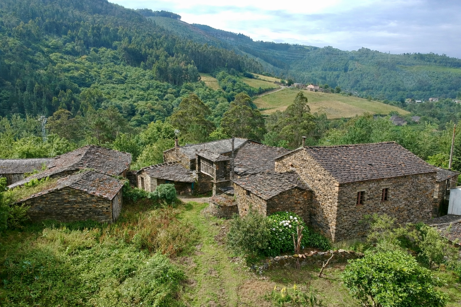 La aldea está compuesta por 17 edificaciones tradicionales, todas construidas en piedra y cubiertas con tejado de pizarra, entre las que se incluyen varias viviendas, almacenes, pajares, hórreos, hornos de piedra y una auténtica lareira gallega.